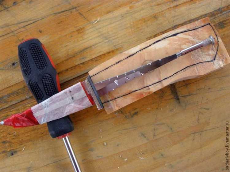 Разметку хвостовика проводят по центру оси клинка. Используют разметочный циркуль и штангенциркуль. Заготовку фиксируют в тисках, хвостовик вырезают ножовкой по металлу либо отрезным кругом. Шлифуют напильником до ровной геометрии, контролируя симметрию.